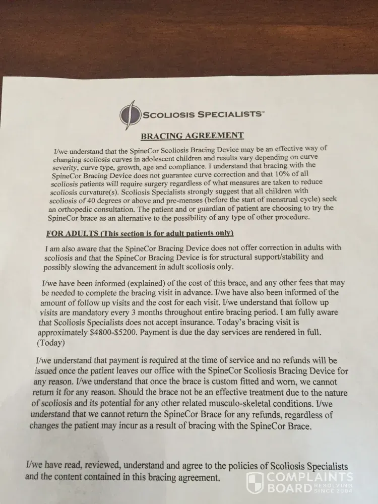 At 85 years, I developed scoliosis and my daughter thought I should see Spinecor and they happily took my $5000, before advising I should check with insurance before I paid the fee. The "brace" did not fit and they agreed to get another size which still didn't fit. The top was too small, but the female doctor said it was perfect. Neither of them bothered to contact me when I told the receptionist I (after 3 visits) would not be returning. Once they get the money, they are happy not having you return. I spent more money with a tailor trying to alter it so it wouldn't buckle up. I would be willing to enter a class-action suit.