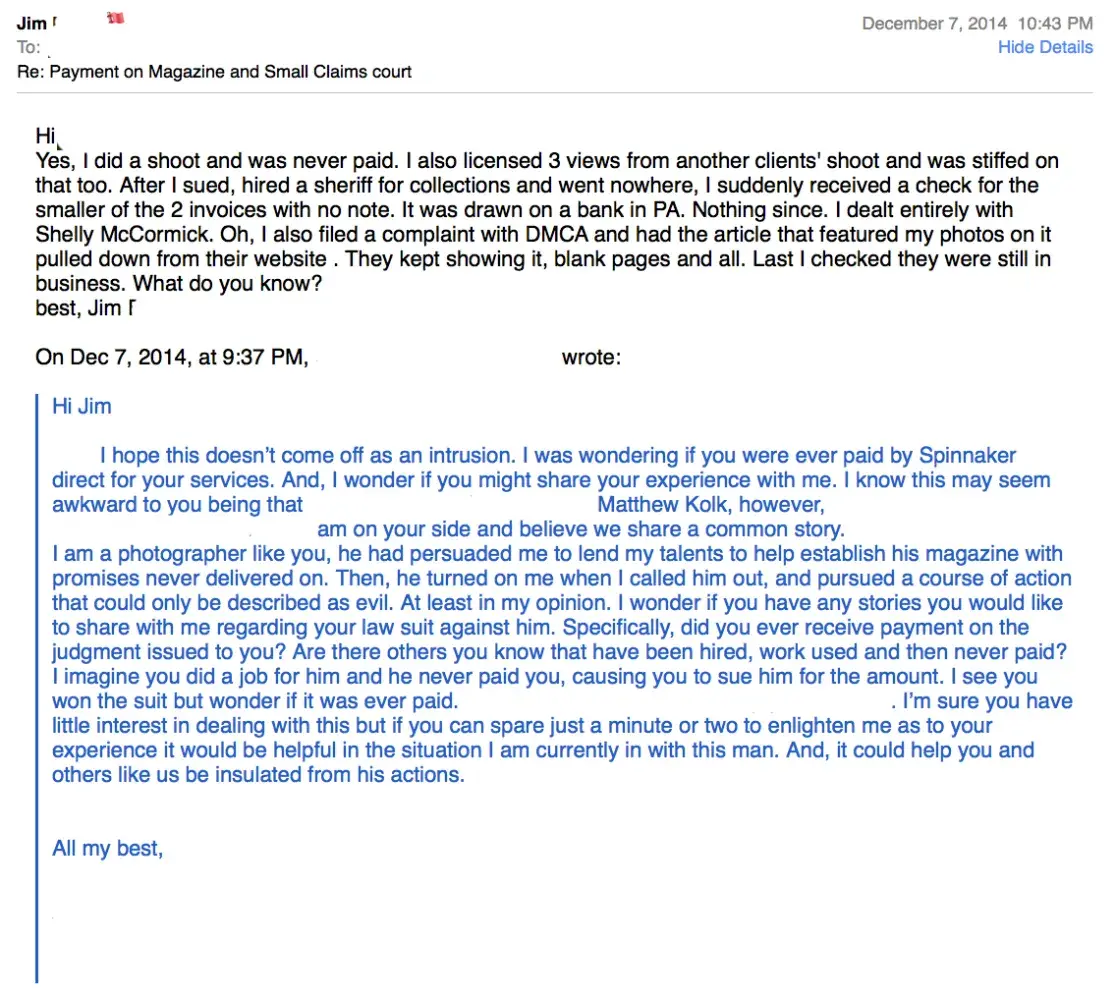 Photographer sues spinnaker direct, publisher of fairfield county home magazine, owned by matthew kolk for non - payment of services. Matthew kolk is ordered to pay photographer $1824. 00 in december 2010. It appears that full payment has not yet been made a full 5 years later. Matthew kolk changed the name of the magazine to east coast home and is the principal of the publication. It is worth considering this event when doing business.