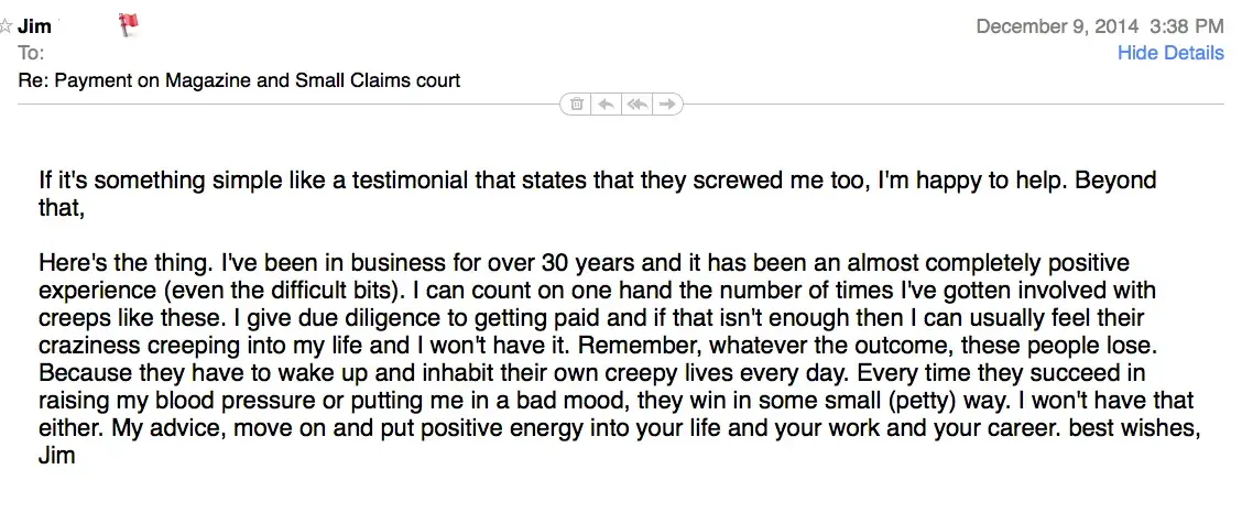 Well, lets let the photographer speak for himself. Feel free to view the email he sent in december last month regarding the state of this situation. If you speak for him and say he was paid i suppose you should update your information. Truth always wins in the end. You cant hide from the truth it will always come forward and there is so much out there to support these claims against you this is just one of the many many people that have come forward. Be careful as you might inspire a class action against your publication.