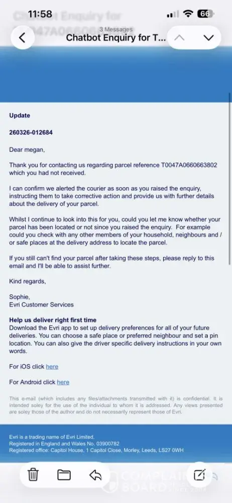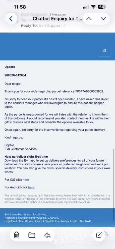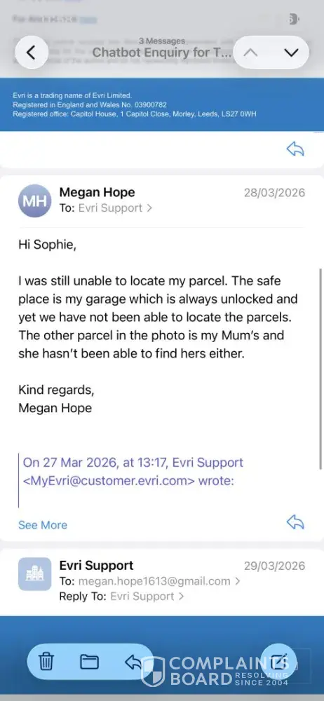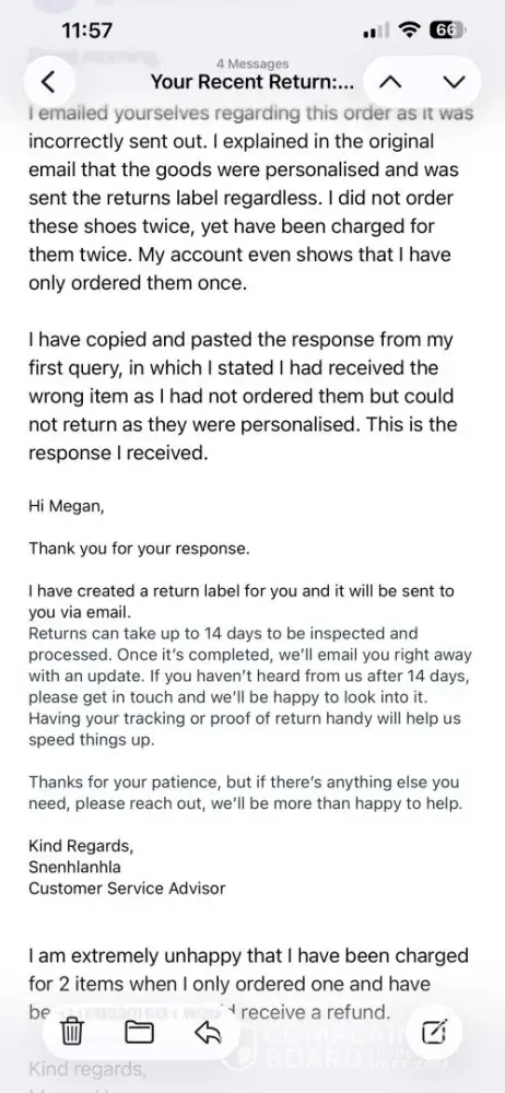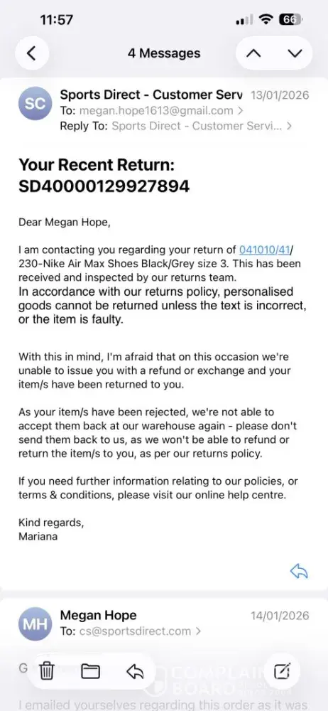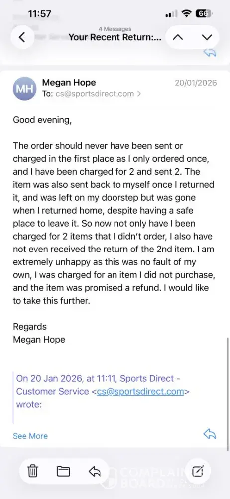 For Christmas 2025, I placed an order for a pair of Nike Air Max Shoes Size 3 with personalisation as a christmas present. The order was placed, charged, and sent and I received the order. Around 1 week later, I received the exact same order, as charged again, yet on my Sports Direct account it was only showing the one original order. I contacted Sports Direct who said it was an error on their part and to return the parcel, even though it was personalised. They sent a returns label and I returned it. The parcel was received by Sports Direct and I received an email on Jan 13th to say they could not accept the return as it was personalised and the item would be returned to myself. I responded to say that I contacted them and they said it was fine to send them back. I sent them the original response I had received. I put across that I was extremely unhappy that I had received and been charged for an item tat I had not ordered and was not showing in my orders on my Sports Direct account. I received a further response to say that as per policy, they cannot accept personalised returns, again, and that they would be returning the order to me. I then was sent the order back to myself through Evri, who showed the delivery photo of the parcel on my doorstep (I have a safe place listed) and when I returned home from work, the parcel could not be located and has since not been found. Therefore, I have been charged for and not received an order that I have not even placed. The lack of communication from both Sports Direct and Evri has been absolutely horrendous, despite numerous emails from myself to chase them up.