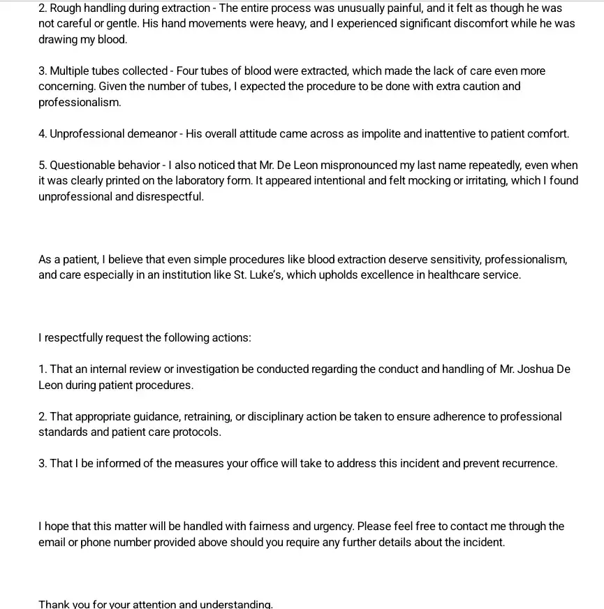 Mark Cristopher Siblag Road 13 Nagtinig Taytay, Rizal Mackysiblag.[protected]@gmail.com [protected] Date: October 29, 2025 To: Patient Relations / Customer Service St. Luke’s Medical Center - Quezon City 279 E. Rodriguez Sr. Avenue, Quezon City Email: customer.[protected]@stlukes.com.ph Subject: Complaint Regarding Unpleasant Blood Extraction Experience - Mr. Joshua...