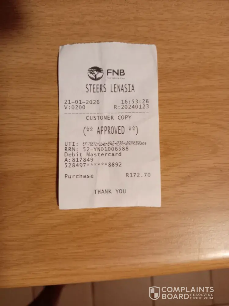 I purchased products to the value of R289.50 at Cape Town International Steers on Sunday @ 11h00.