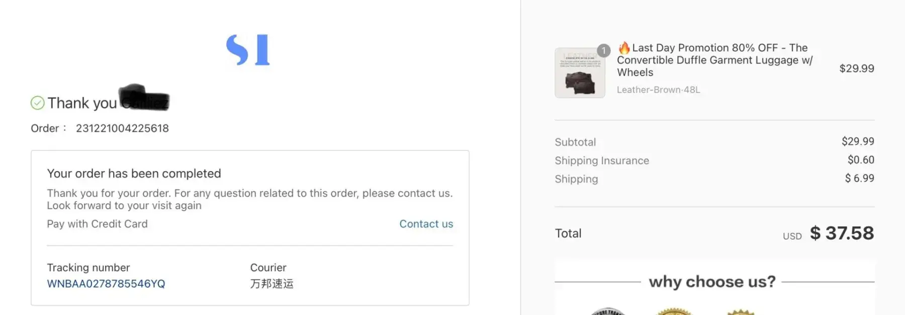 I ordered a beautiful leather bag on wheels on 21/12/2023 for my husband (Christmas gift). The order confirmation came with a logistics confirmation number to follow the package.