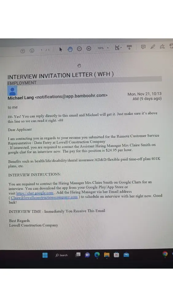 Good morning: My name is Marla Davidson [protected] I have my resume posted on Indeed. 11/21/22 - I received an Email from Michael Lang regarding a Remote Customer Service Representative / Data Entry position. He referred me to Claire Smith, Assistant Hiring Manager of Lowell Construction Company, Salt Lake City, Utah. I interviewed with Claire Smith...
