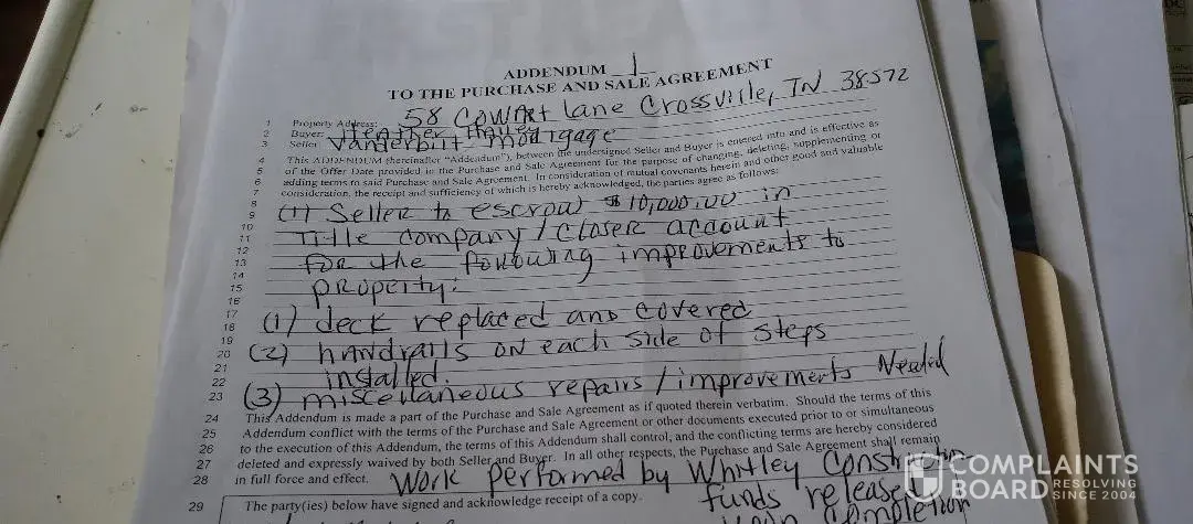 My realtor, as part of my purchase agreement, gave the repair job to her husband who claimed to have a construction company. The agreement was between me, Vanderbilt mortgage and her husband. The mortgage company had written in for him to provide evidence of completion for the $10,000 I paid for the repairs in exchange for a $10,000 discount on the selling...