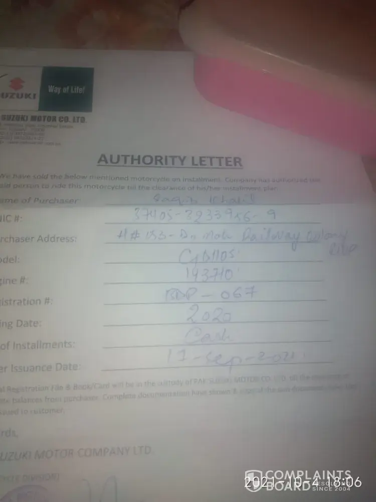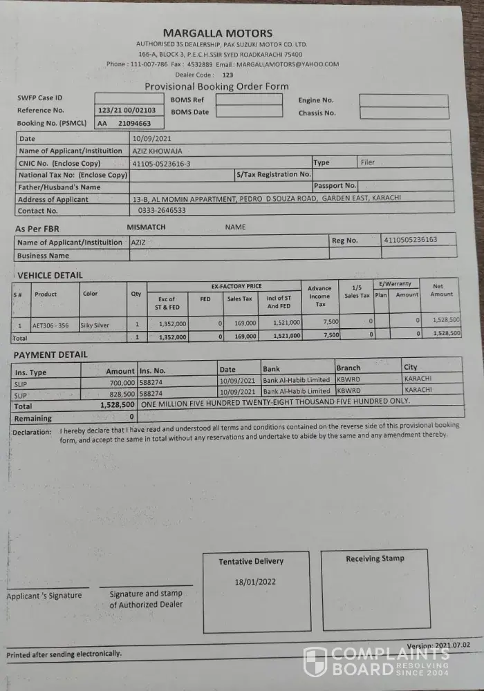 I booked my Alto AGS on by paying full amount PKR 1528000/- in shape of pay order to Pak Suzuki ltd via authorized dealer Suzuki Motorways dtd: 15 Sept 2021, they provided me booking no PBO [protected] on 15 Oct 2021 after a month delay with the tentative date of delivery 10 Feb. 2022, i also paid FED which was imposed later by Federal government PKR 43000/- just bcz of negligence of Authorized dealer, but still I have not yet received the booked unit no one is responding. they always have excuses but no one is responding no the Customer care nor Dealer, what should i do ? Should I go to Court of Law or any other regulatory authority ?