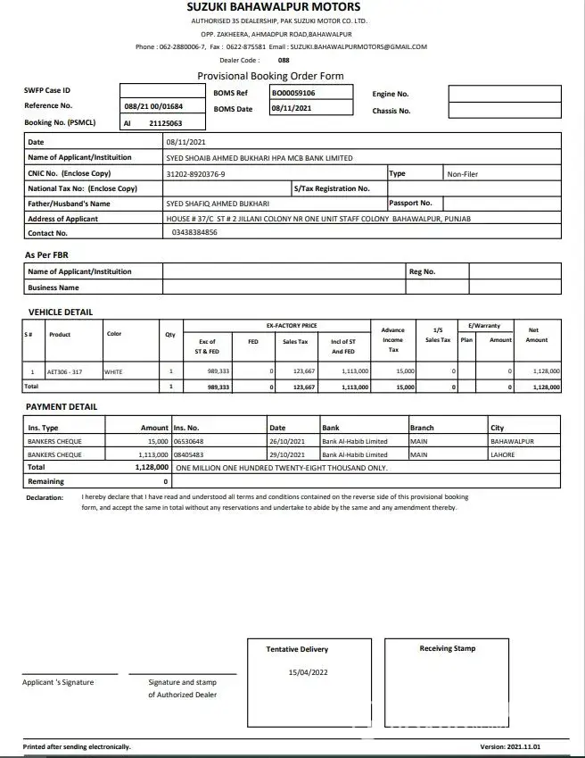 It is Submitted that i have booked my Alto VX vide booking number:AI [protected] dated 08-11-2021 through MCB bank. Its tentative date provided by the company is 15-04-2022. i went today at Suzuki dealership Bahawalpur for taking the delivery but unfortunately, they said your car is not delivered yet and maybe it will be late. kindly deliver my car as its time period given by the company is complete.