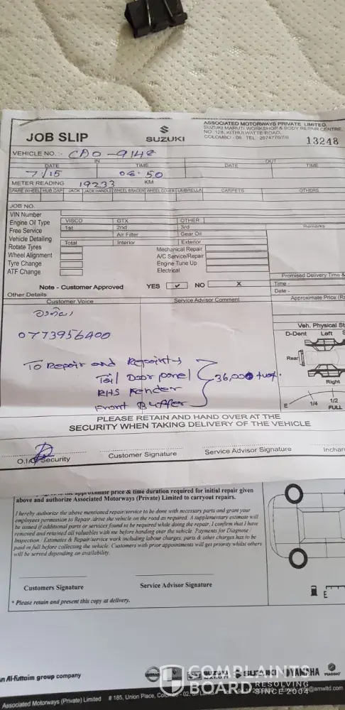 Suzuki swift repairs. Complaint on extremely poor service by the agent amw sri lanka
