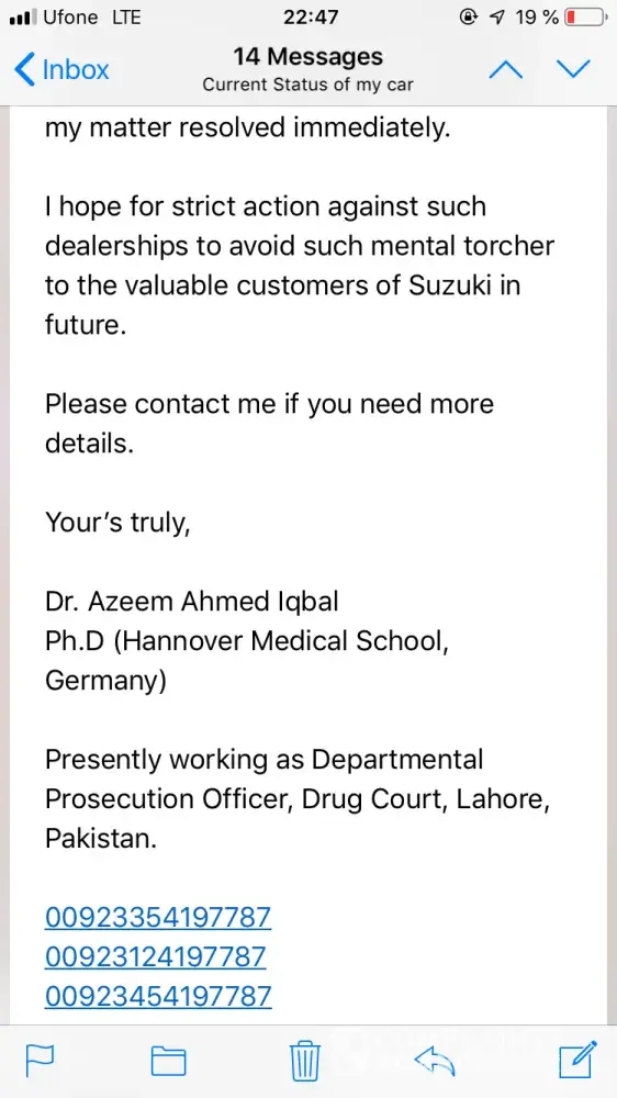 I am sure that management of Pak Suzuki will look after my concerns and will compensate me in the best possible way. I am sure that for Pak Suzuki Motors, customer always comes first, and they will not compromise on the quality of the vehicles. Looking forward for long relationship with the Pak Suzuki Motors Company.
