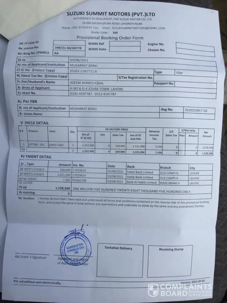 Fraudulent booking by suzuki summit motor, Lahore, Pakistan