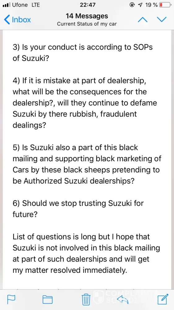 List of questions is long but I hope that Suzuki is not involved in this black mailing at part of such dealerships and will get my matter resolved immediately.