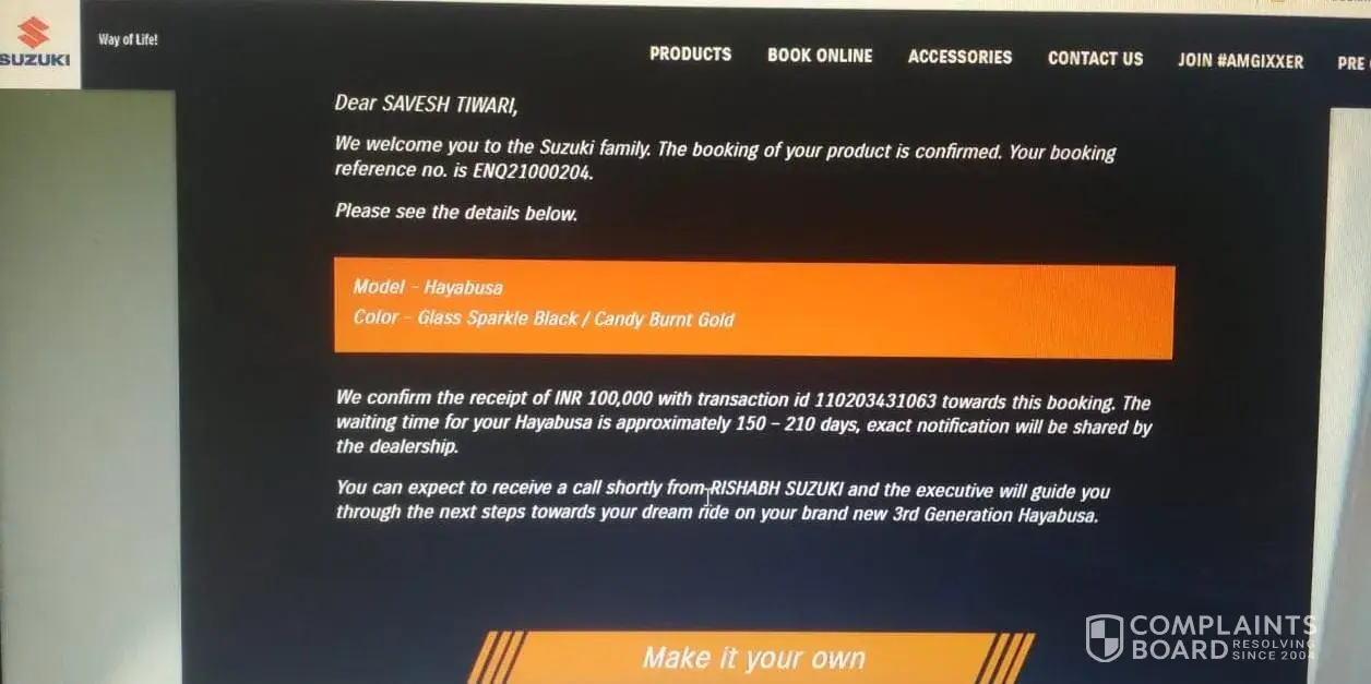 After speaking to a local dealership called Rishab Suzuki in Rajasthan about buying a third generation Hayabusa, I had made my decision that I wanted to buy a new Hayabusa. So immediately I sold my Harley Davidson Fatboy motorcycle and on June 3 2021, I had transferred Rs. 1, 00, 000/- (Rupees one lakh only) as advance payment to Rishab Suzuki. As a result of this booking I had received a confirmation mail from Suzuki India about the payment received. But this confirmation email did not contain any delivery information.