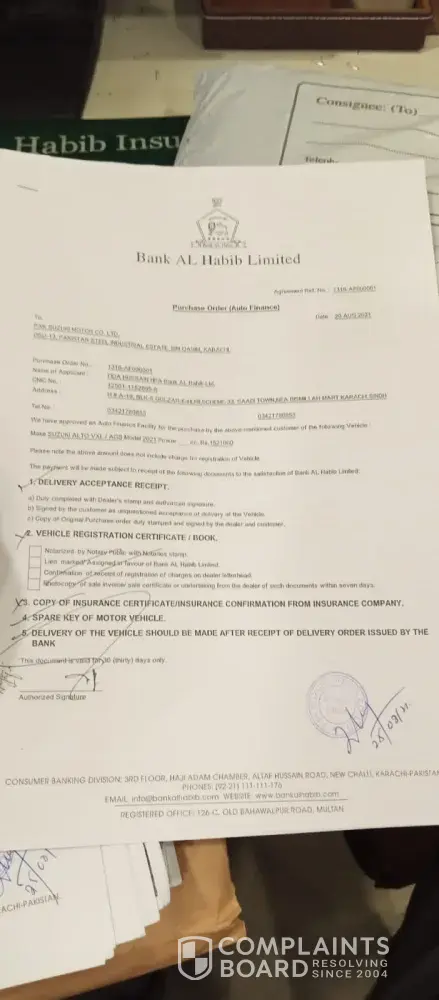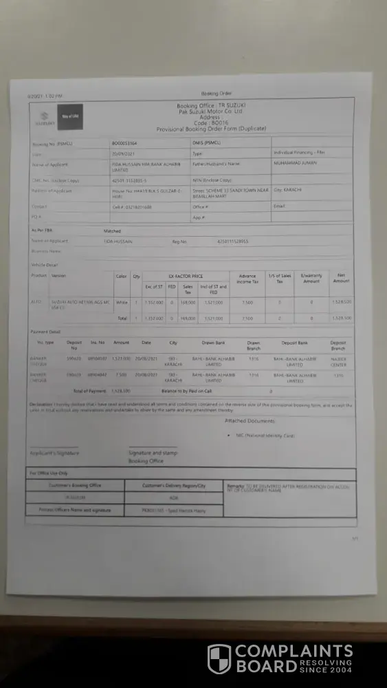 All essential payments were directly removed from my BAHL account on August 20, 2021, and all receipts from the Suzuki company are attached herewith, but I have not been able to receive PBO form I've been calling your and your bank's representatives on a regular basis, but I have yet to receive a booking PBO number or showroom information. However, after calling Pak Suzuki, and the bank finally, received PBO after a month on 20 September 2021, the payment was received one month before and they issued me PBO form after one month even until today I don't know the delivery date. Kindly resolve my issue and deliver the car from the date of receiving the payment at Paksuzuki