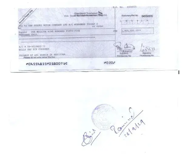 The concerned Suzuki personnel Mr. Zohaib had collected the Pay order without provision of booking order receipt. The undersigned had shown concern on it but the said officer of Pak Suzuki has given some technical excuse and provided receiving on the photocopy of the PO (Attached as Annex-A) and ensured to send the booking receipt by next day. On the next day, the concerned officer has told me that the booking receipt will be shared by the assigned dealership which would be communicated when assigned. After continuous follow-ups the undersigned has received the provisional booking receipt from the dealer named Suzuki Nadeem International (Not from booking Office) referred by Suzuki booking officer. In provisional booking receipt, Booking number was missing with wrong contact number which was reported to concerned dealership officer Ms. Kousar at "Suzuki Nadeem International" who told that the booked car has been assigned the Chassis No. and Engine No. due to which the booking number was not shown. The same has been communicated to Suzuki booking office official Mr. Zohaib for verification which was verified by him.