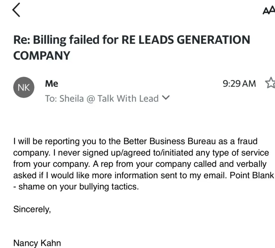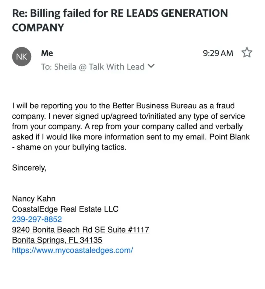 Talk With Lead Unlawful credit card transaction and receiving threatening emails from Talk with Lead