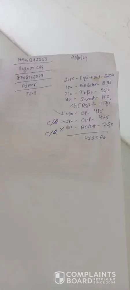 Dear Sir Myself Ajmer Singh have a Tata tiago which had purchased in 2024. On my first service the service advisor Mr. Amit estimated me 4555 for service. In this estimate very higher rate is then MRP on products , there are very robbing in this agency. ACVENT tell me in estimate Rs. 650 and The MRP was on this 295/ AIR FILTER tell me in estimate 710 and...