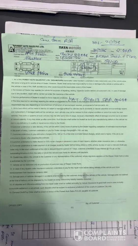Respected Sir/Madam, I submitted my vehicle — a Tata Nexon iCNG — to your facility on March 20, 2026. After conducting a diagnosis, you noted complaints regarding the battery, clutch, brakes, and starting mechanism, and charged me ₹1,250 plus GST for the service. However, when the vehicle was delivered to me on March 25, 2026, you had addressed only...