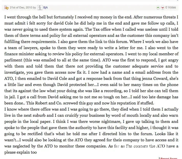 The agent made promises that our personal and company BAS has been completed and submitted which they were not for nearly 2yrs. The agent promised us that the returns were lodged for 2012 which they were not as discovered once we went to a new agent. Promised to return emails, phone calls, return documents needed for other matters, all of which were...