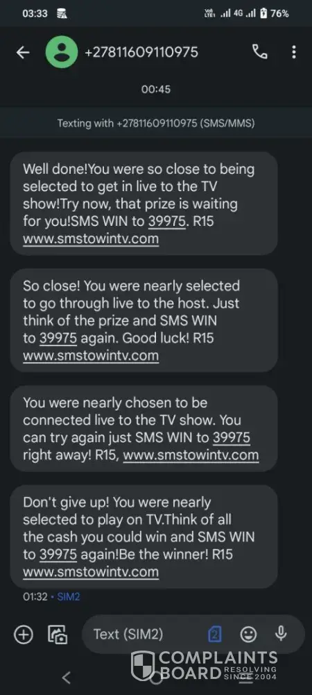 I never knew the game it's a scam😭💔, My R40 airtime is gone as I write this message ryt now 💔, I'm heart broken 💔 😢. People please be aware, the SMS WIN game SHOW it's REALLY a SCAM I repeat SCAM😭.To my side the things that made research about it is that " How can I not be chosen whereas there's no one who's on the call with the host"💁‍♂️ and " YY those people who win the money on the T.v show (SMS WIN show) not expressing joy feelings after speaking the right answer "💁‍♂️ so PLEASE PLEASE don't fall on their TRICKS It's enough Those people are making millions from us whereas we're suffering 😭😭💔