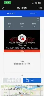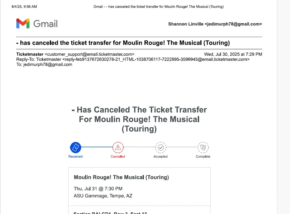 I had purchased tickets to see Moulin Rouge in Phx on 7/31, seven months prior as a Christmas gift. Going through ASU's site I had no choice but to purchase with Tickets-Center. on 7/29 I contacted TC because I hadn't received my ticket transfer email. A chat agent found my order and directed me to my Ticketmaster App, where I could now see my tickets. Day...