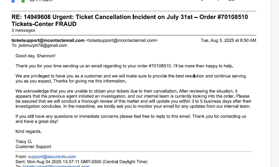 I called again on 9/25/21 and explained that the event was the next day and I needed the tickets urgently. They said they would contact the seller to send the tickets and asked me to create a new gmail account. I did as they asked, but still didn't receive the tickets. Finally, they sent me the link to accept the tickets on this newly created email account just 3 hours before the event! This was not enough time for me to accept the tickets, create a SeatGeek account, and make the long commute to the stadium.
