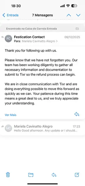 Last year I bought tickets for an event called Rock the Tides, which ended up being canceled. I contacted the event organizer several times and they told me to wait because there were issues with the insurance company and that I would receive my refund soon. Until now, I haven't received it and I've already missed the deadline to contact my credit card company. I'm attaching the emails I exchanged with the event organizer.