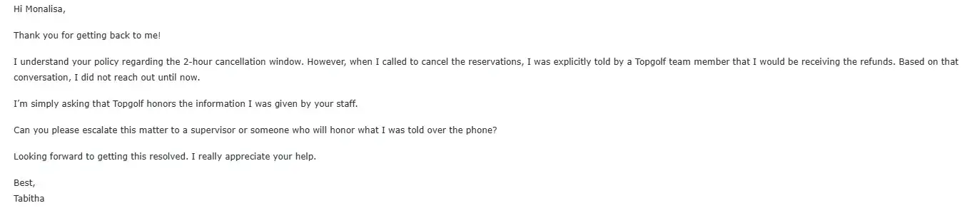 I made two reservations at Topgolf El Segundo but had to cancel. When I called to cancel, I was assured over the phone by a Topgolf team member that I would receive a full refund for both transactions. Based on that confirmation, I expected the refunds to process within 3–5 business days as advised.
