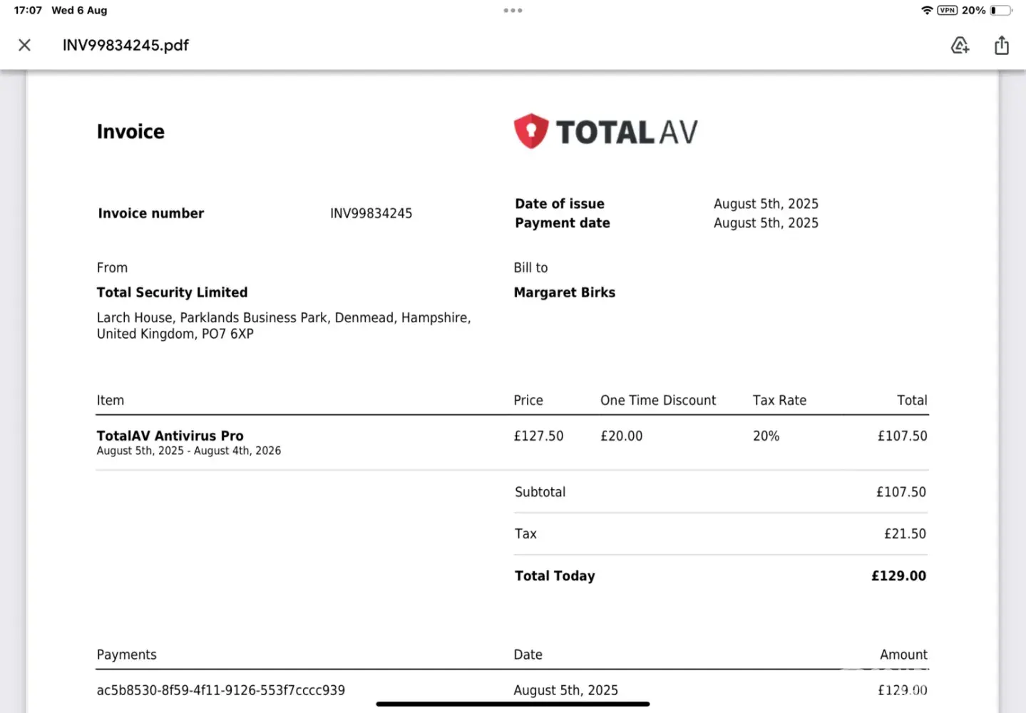 You have just charged me £297.00 for Total AV renewal, this has always been around £14.00. Invoice 95491447 for £297.00. I will have difficulty paying this huge price increase. On top of that I found it difficult, if not impossible, to contact TOTAL AV in order to complain and ask for an explanation. I am now considering cancelling my subscription and requesting a full refund.