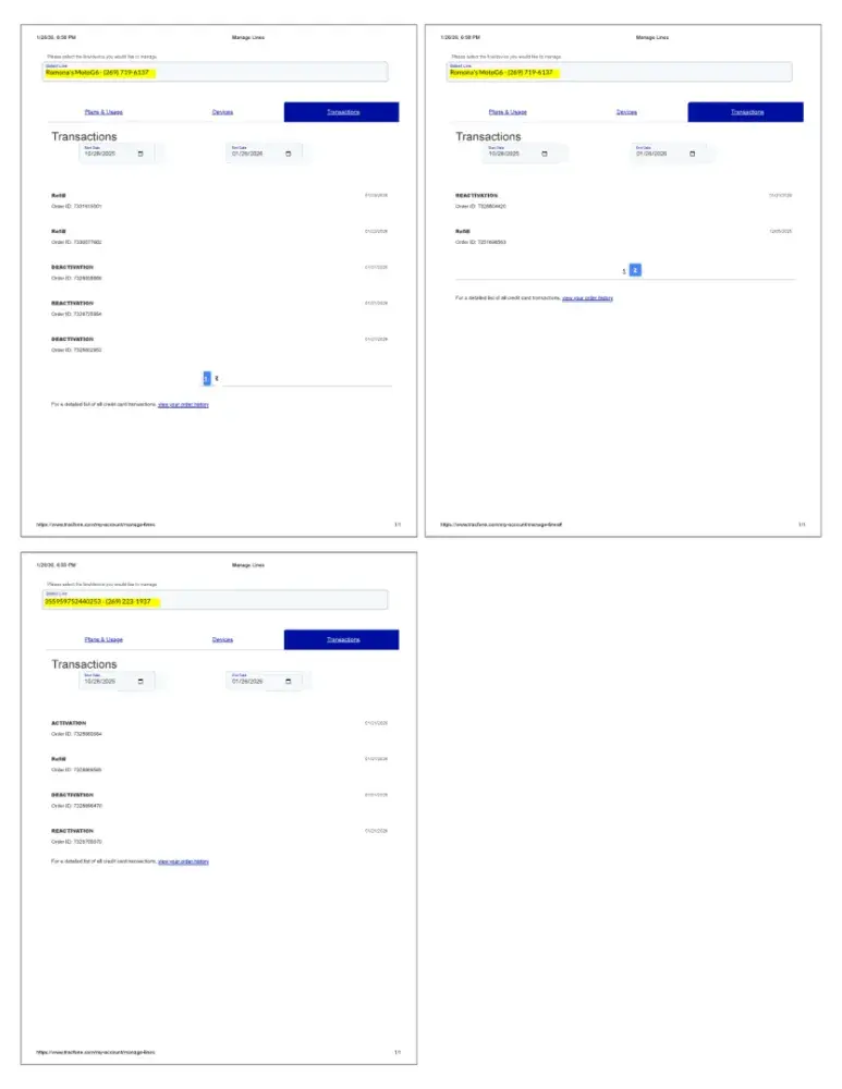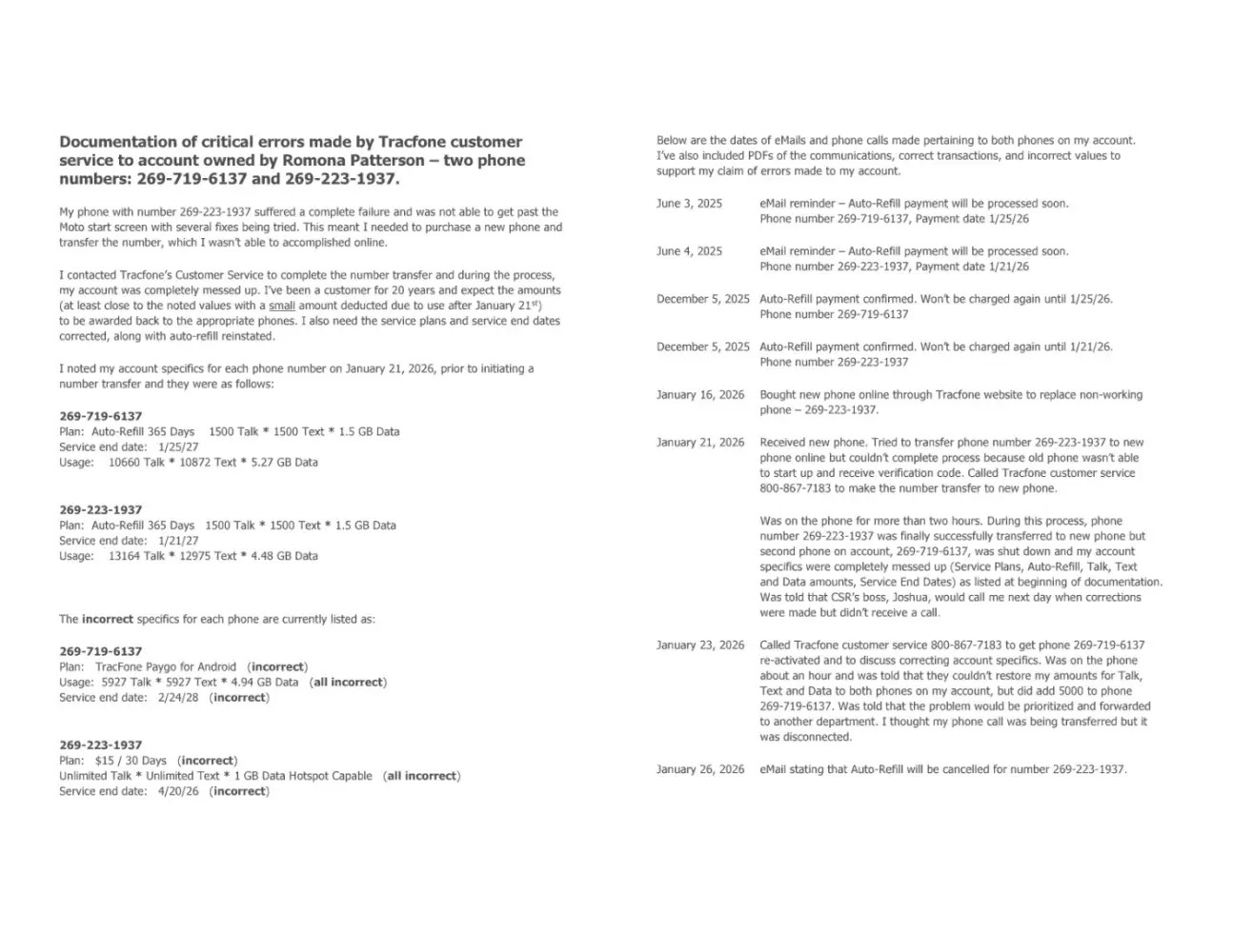 While trying to transfer number to new phone, all account information for two phones on my account was changed by TracFone customer service reps. Several .png files are attached as support for changes that were made, and need to be corrected. The file named "Documentation" explains all actions by date and what Plans, Usage and Data should be.