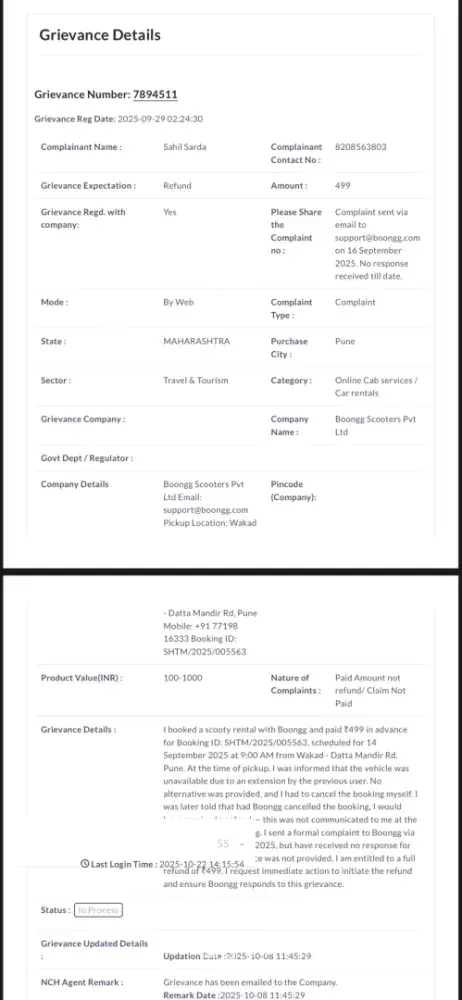 BOOKING DETAILS: Company: Boongg Scooters Pvt Ltd (www.boongg.com) Booking ID: SHTM/2025/005563 Transaction Date: September 14, 2025 Amount Paid: INR 499 (approximately USD 6) Service: Motorcycle/Scooter rental in Pune, India WHAT HAPPENED: Booked scooter rental with advance payment of INR 499. While traveling to pickup location at their Wakad office, I...