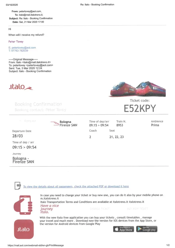 Read full complaintItalo - Nuovo Trasporto Viaggiatori S.p.A - Refund