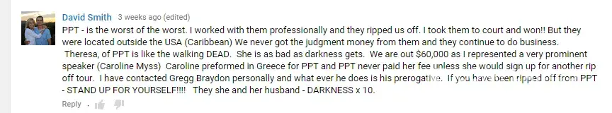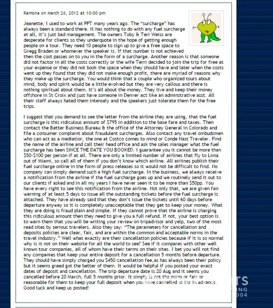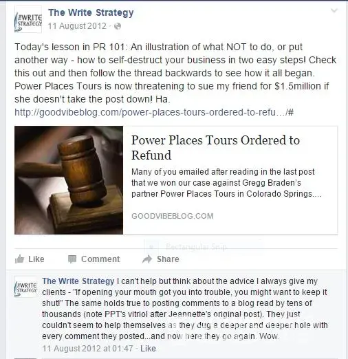 Lauri Wilmott, Executive Director of Gregg Bradens Press Office, is involved in a scandal that to quote him, uses a company called Power Places Tours, who have a track record in handling 'difficult situations'. Those difficult situations are handled by Gregg Braden condoning litigation fraud and people being ripped off in bad faith, and subjected to...