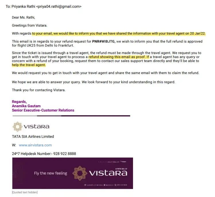 Now travelgenio is not issuing us our refund. They don't even have the courtesy to reply to email. Even if I call they don't try to understand the problem, they just say call the airlines again and again. Its been 4 month now. Please find below the flight Details: