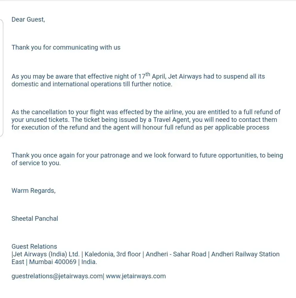 In reference to your query, we would like to inform you that since Jet Airways has ceased all their operations, we are gathering all the necessary information with the airline in order to get your tickets refunded. Please, bear in mind that due to the bankruptcy process the airline is going through any refund request is more complicated than usual.