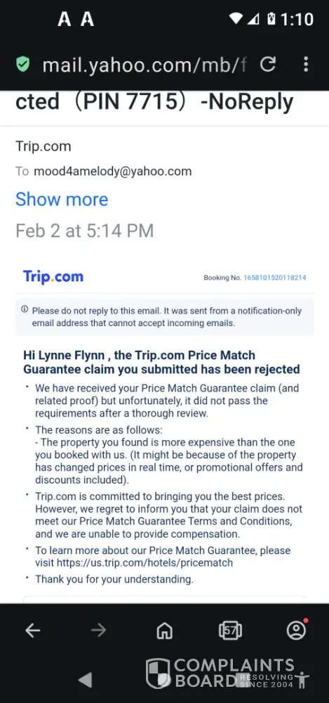 I contacted a representative on the website chat to claim the price match guarantee as my non-cancellation booking through trip.com cost $35.33 MORE than if I had booked it directly through the hotel website, and the site claims " We Price Match - We aim to offer you the best possible price. If you find a cheaper option elsewhere, we'll refund the...