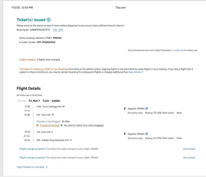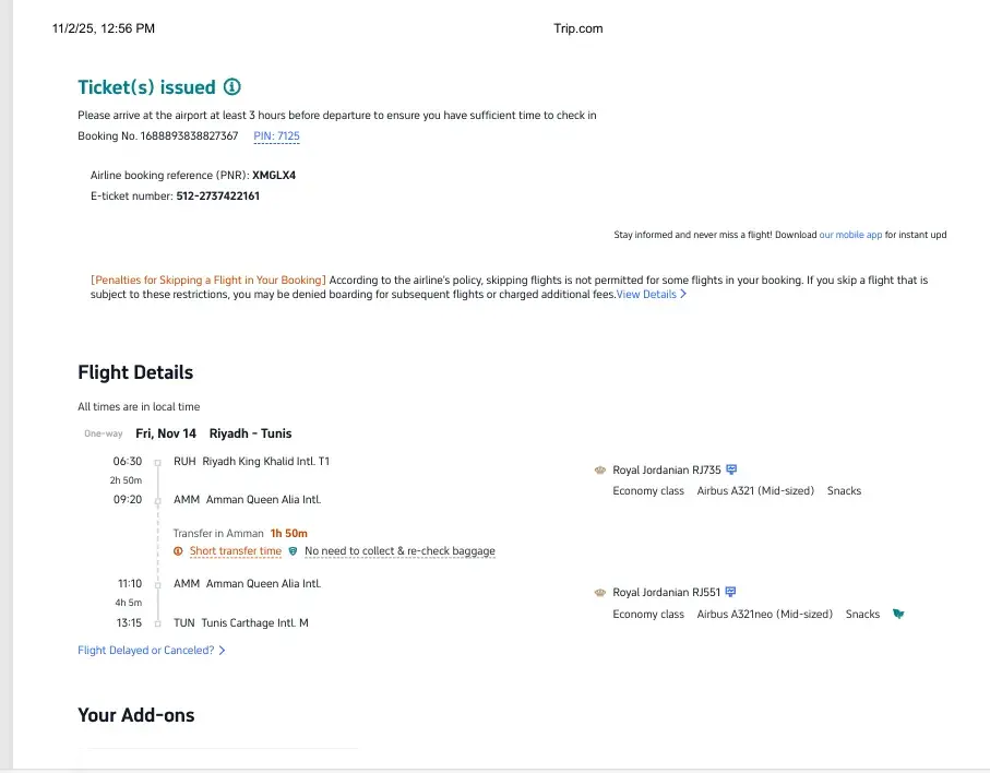I am documenting Trip.com's egregious executive misconduct. They sold a flawed itinerary (Booking Ref: 1688893965459175 for November 7, 2025) that resulted in my DENIAL OF BOARDING and significant financial consequential losses (including missing insurance premiums and replacement flights). The core issue now is their documented pattern of executive fraud...