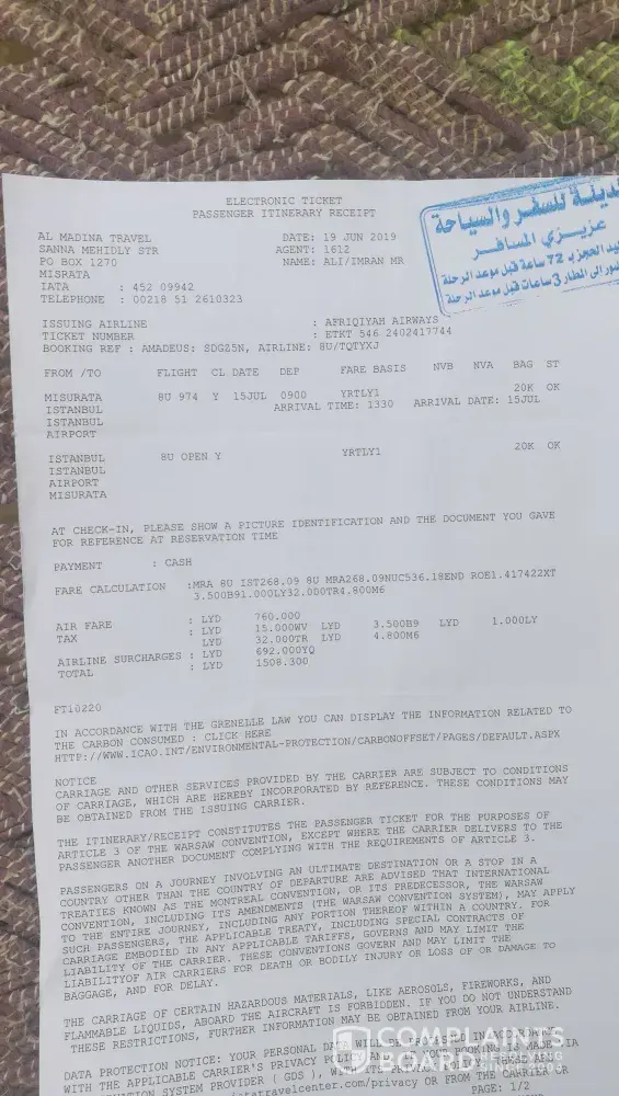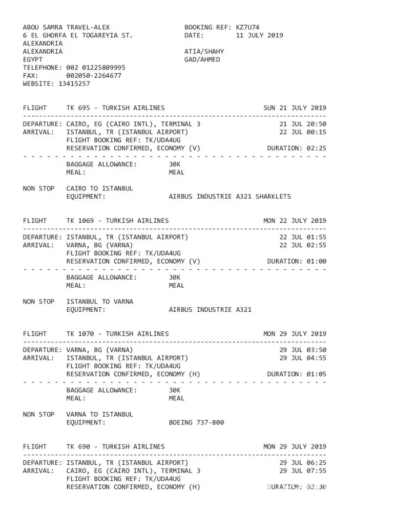 Flight no. TK 695 Cairo/ Istanbul 21/7/2019 8:50 pm