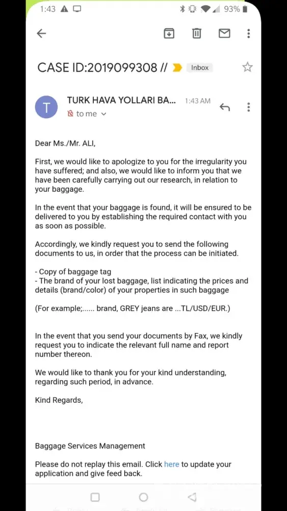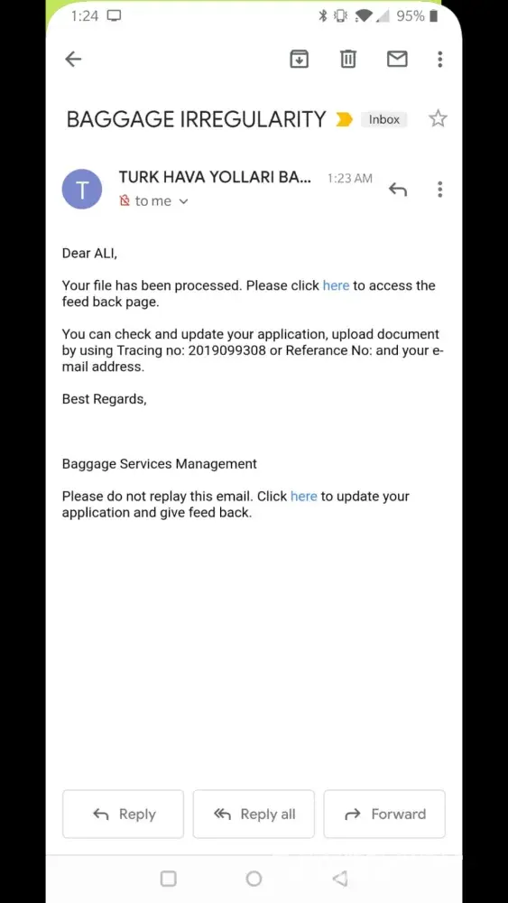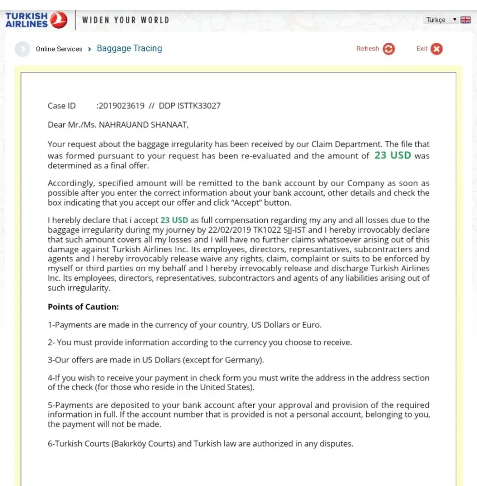 Turkish Airlines missed baggage