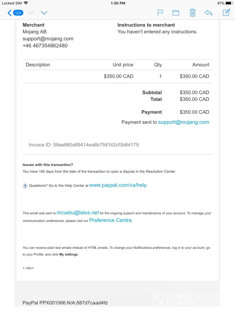 I have received an email from PayPal detailing a transaction I supposedly have completed on February 14, 2018. When I have verified my PayPal account I could not find any record of this transaction. I did not buy anything from Mojang AB and I consider this as an attempt to hack my PayPal account. In the received mail there is a login link that opens a login...