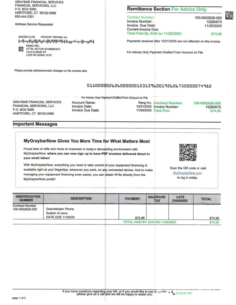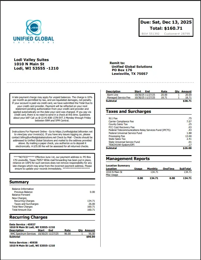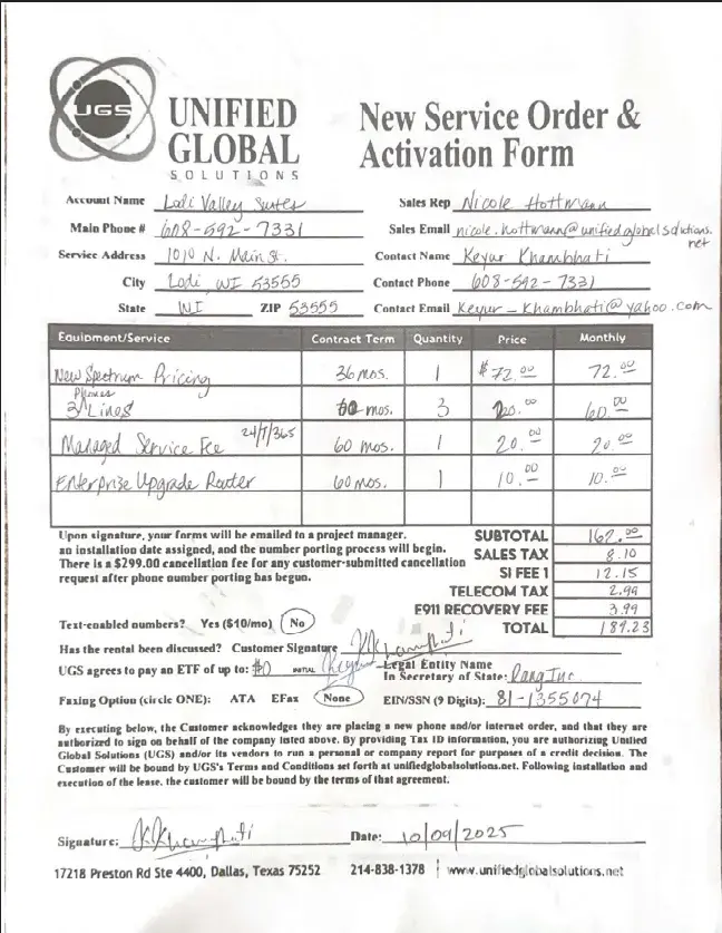 Stay Away! The Salesperson stop by and quoted the price i.e. $189.00 Per Month by matching the price with current service provider. However, actual invoice after signing the agreement is for $235.00 per month between Equipment Finance company Grabar for $75.00 and USG for $160. We brought to their attention, and they denied fixing the invoice. So, we decided to exit the contract since they bind you with non-cancellable long-term agreement where you decide to exist there is no escape. Further, they are telephone number hosting company, they subcontract the services with third party for internet and Equipment rental at time of signing the purchase quote they don't even clarify where they follow unethical and malpractice.