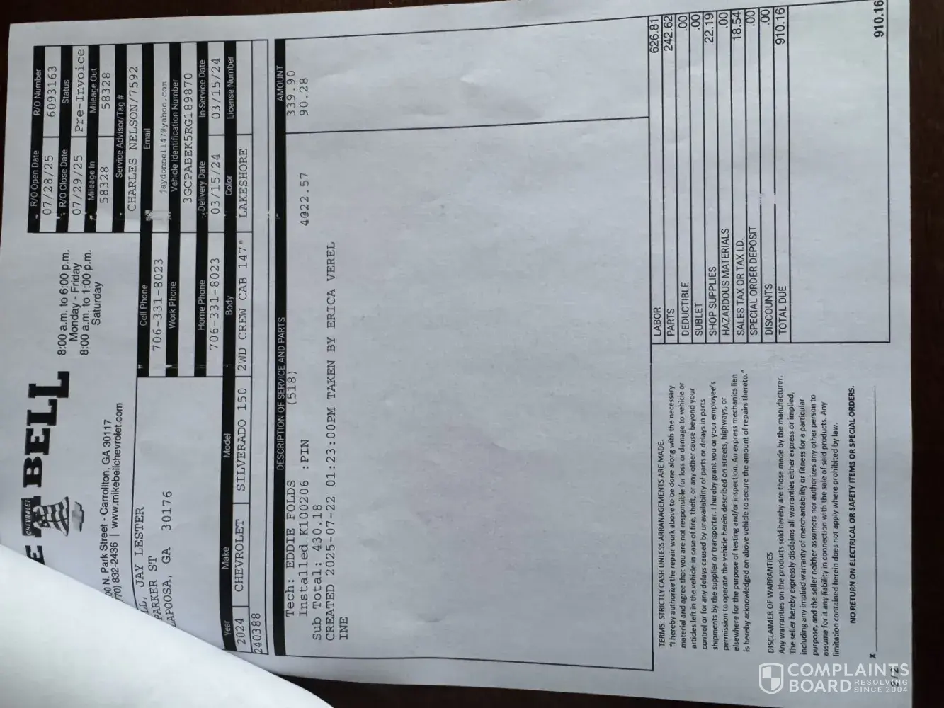 The basic left the alignment pins out of my truck and it starting knocking and I had to get Chevy to fix it and it cost 680.00 to fix. The tech was negligible and I am not taking the 130 refund for alignment. I have tried contacting the training manager and no response. I am prepared to move forward if I don’t get a satisfactory outcome. This is the second time I have filed a complaint. The company acts as this is not a problem