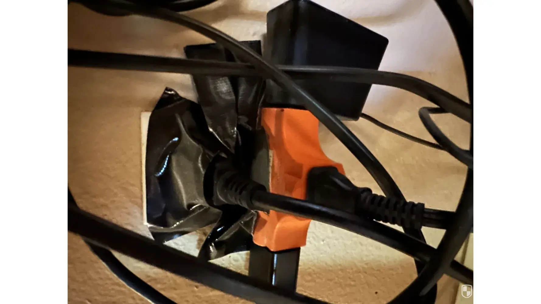 Black duct tape wrapped around electrical cords (fire hazard no doubt)