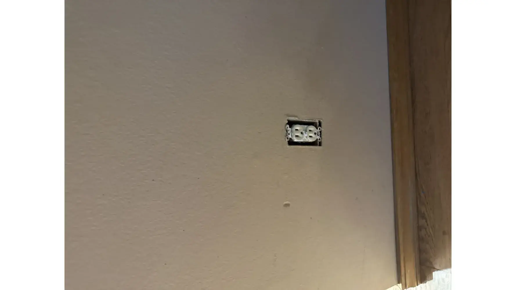 Outlet plug cover is missing in the kitchen.