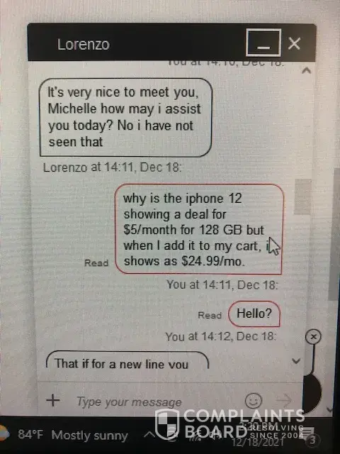 I ordered an iPhone 12 through the Verizon add a line, get an iPhone 12 for $5/mo on Dec 18. It didn't check out at that price immediately so I checked with online chat (Lorenzo) & he said it would be credited back. I then had other issues with upgrading 2 lines which after EIGHT hours of online & text support were finally resolved with Riley & some other unnamed agent who convinced me the add a line promo would be credited to my next bill. I reached back out about the add a line issue on 12/19 and was again assured that I would receive a credit and to reach out if I didn't see it. On 01/08, there was a chat with someone who then dumped me off to Eva, then on 01/09, it was Adrian. Every time I was assured to just wait, Adrian specifically stated it could be 1-2 billing cycles before I was credited. Then on 01/10, I get a random text from Devin stating the same thing! 1-2 bill cycles. On 02/18 I reached out because there was an issue with an international call which was eventually resolved but I also inquired about the add a line promo because I was on the 2nd bill cycle with still no credit showing up. At that time he said he was submitting a promo correction request and I would receive a confirmation e-mail in 7-10 days. I never received one, instead I went into the support portal and saw where they were trying to now say that it was tied to having an unlimited data plan! That was not in the promo ad & was NEVER stated up to that point by anyone. Don't you think someone would have seen this sooner?! Including at the point I ordered it and was using their online chat? Also, I had tried to call in but their phone system would only direct me to online chat. Since this time, I have reached out & texted with Alan (02/28), Elena (03/03), June (03/03), and the last person who probably was too afraid to give his name after I said I am filing a complaint. Verizon's online chat and customer service is ridiculous. Every conversation has to be started over completely, even though they will access your previous conversations but then make you repeat yourself ad nauseam. I have copies of every conversation including online chat and text support! I have attached the 1st but every conversation looks like this. I am not showing my phone number here but in every conversation I provided all information so they could specifically see my account! Me asking "Are you sure?" and they continue to assure me that yes, a credit will be applied!