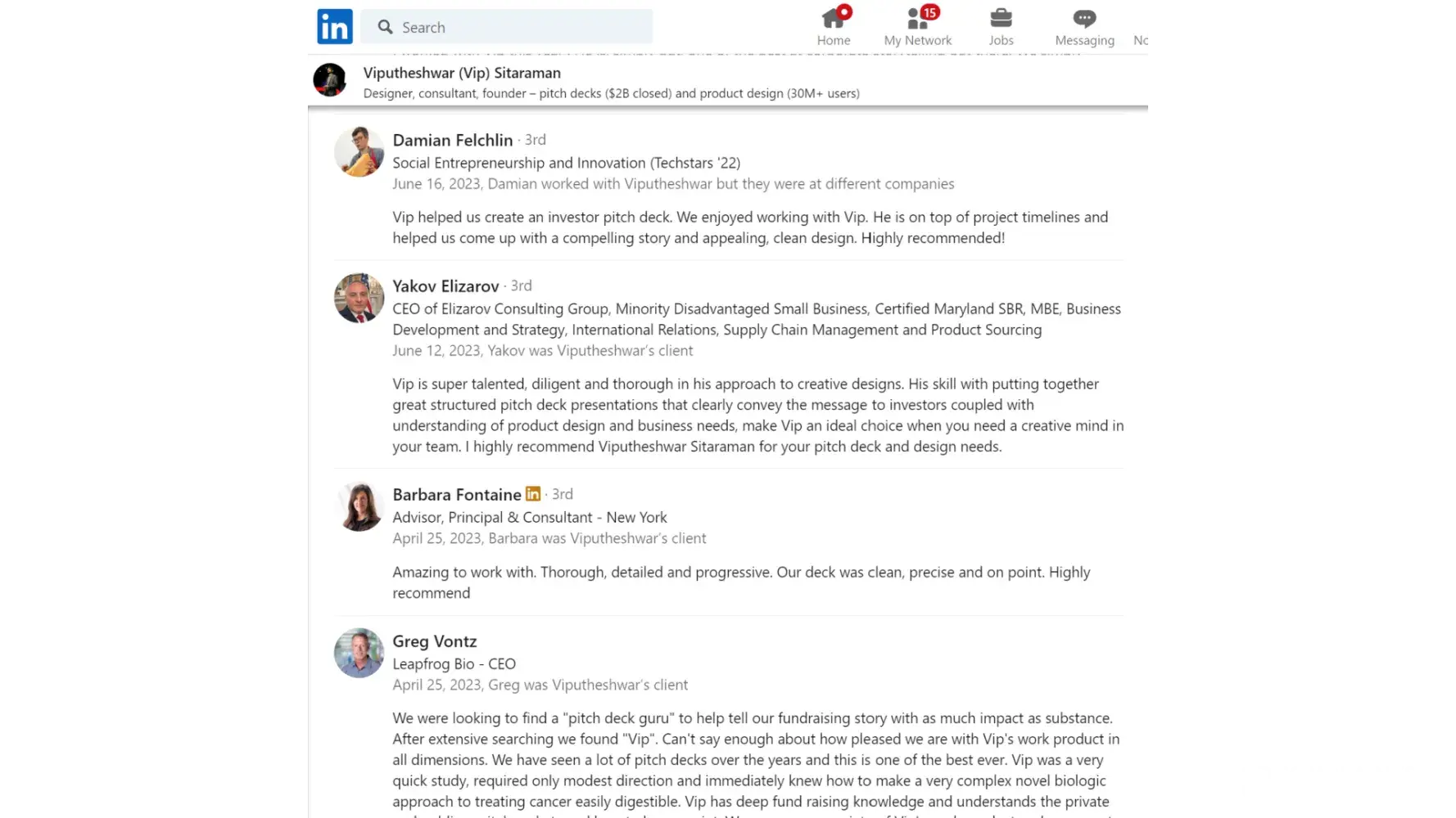 "We were looking to find a "pitch deck guru" to help tell our fundraising story…Can't say enough about how pleased we are with Vip's work product in all dimensions." -- Apr 2023