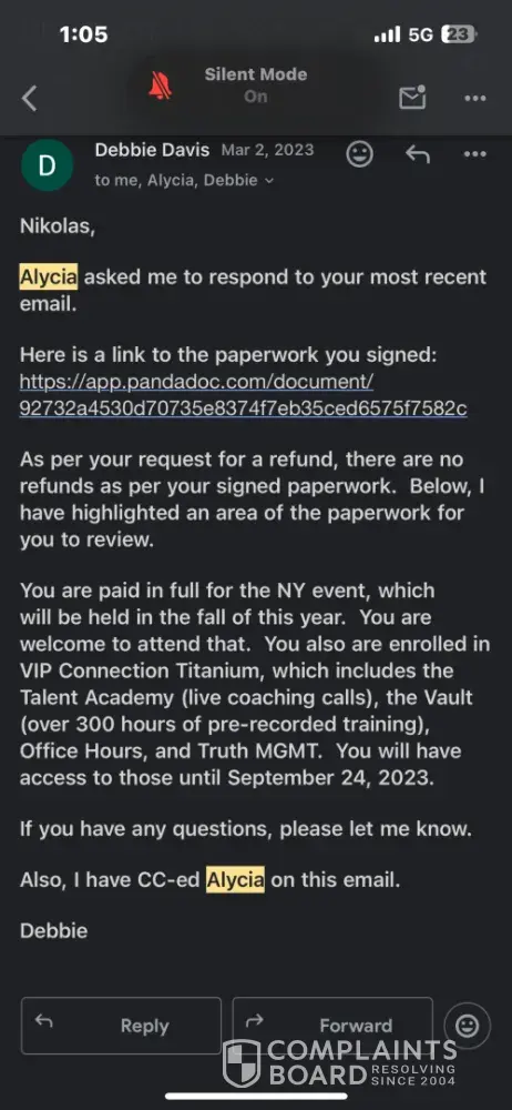 Then she said I had to pay something around $750 for an event held in August. She said big entertainment record labels attend this event looking for talent and that I could perform and network. Red flag number 3: she refused to give me any names of these "promised" record labels and people in attendance. We also discussed a payment plan after I mentioned I only had $70 on me at the time. She said I had to pay $100 today in order to go any further, which was RED FLAG NUMBER 4. No real company will demand an immediate payment. They will allow you to take the contract home for a few days to look over it and review it with your lawyer, but not VIP Talent Connect, because they're a scam. So she took my $70 in cash and demanded I give her my debit card for the other $30. After I did that, I signed the contract AND THEN she told me I had only 7 days to pay the full $750 or whatever ridiculous price it was. My stomach dropped. I felt tricked, but she seemed unconcerned about what she had just done. Immediately after paying, she said goodbye and pushed me out of the office. There was no further information provided, no handshake, no connection established. She was cold, firm, and definitely a scam artist. I left feeling sick and started crying. I called my parents and explained what happened and that's when we found something on the contract where it said we had 24 hours to cancel via phone or email. Of course, NO ONE answers the phone. I don't remember how exactly I got out of the contract, but I did that day.
