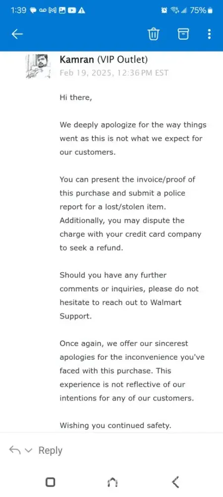 Purchased a laptop from vip outlet via walmart app... I never received my item as it delivered to some unknown address on my street. It was left by a blk folding chair and a picture was taken of it and posted. I walked up and down my street looking for where it was placed and was unsuccessful. I contacted walmart, who told me that they would contact the...