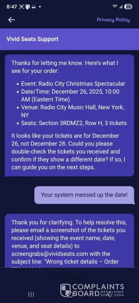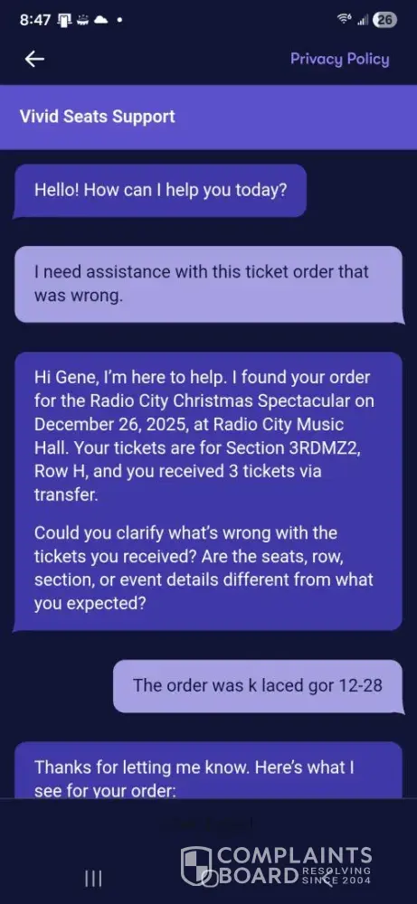 Vivid Seats complaints: history and resolution overview