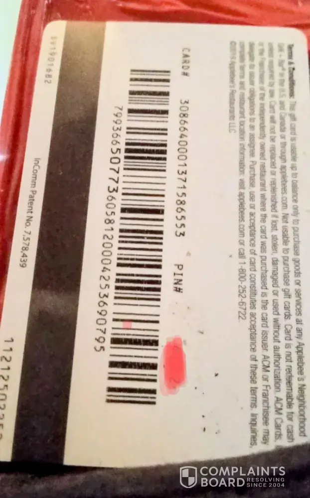I'm not sure if Walmart is the one at fault here with the main issue but they are at fault for taking no action on the issue at hand. I have 2 gift cards, one for $500 and the other for $300. I contacted Applebee's customer service and asked them if they could put a hold on the cards so they couldn't be used. An untrustworthy character had card and pin numbers for both. I was told they had nothing to do with cards purchased through 3rd party retailers. I was told Walmart was responsible. Walmart's customer service informed me Applebee's was the responsible party. After going back and forth using different numbers I found, I got absolutely nowhere. Now, the $500 card shows a balance of zero. I called both parties and asked again, informing each that the $500 card was depleted. Still, neither party would budge on doing anything. I am a customer to both of them. Even though each party felt they weren't responsible, since I am a customer to both, you would think at least one of the two would have put in some effort to contact the other. Especially after hearing about the $500 loss. I was actually phone blocked on 2 different occasions by Walmart for calling too much. I was polite with each call too. This must happen a lot. Walmart actually transfers you over to Applebee's.? It's time to get this straightened out between these two companies. I'm making an identical complaint about Applebee's as well. Thank you in advance Complaints Board. I'm not sure what I would have done if I didn't run into your site. I had run out of options looking for different ways to make contact with each company. Please, if you will, give each my contact information when you inform them of the issues.