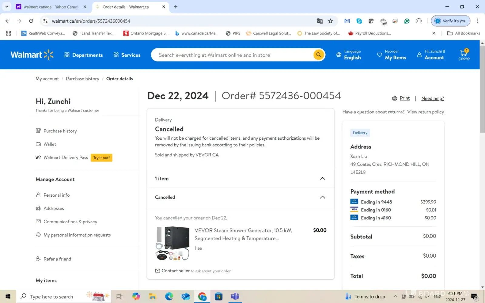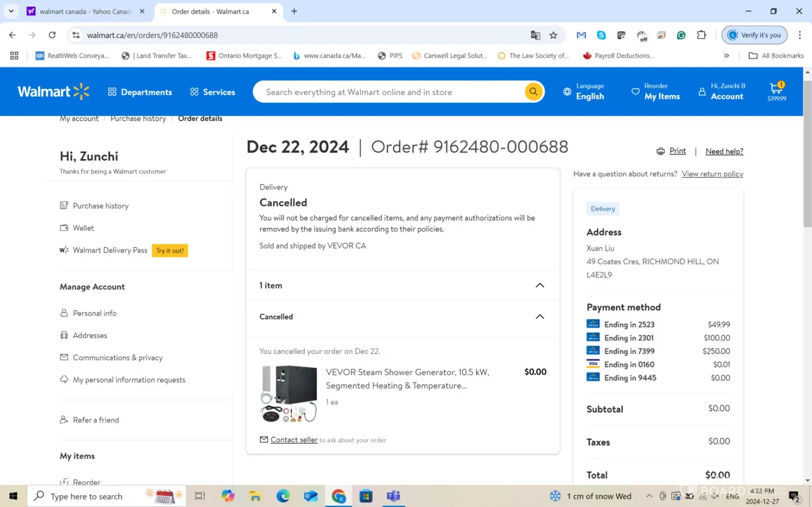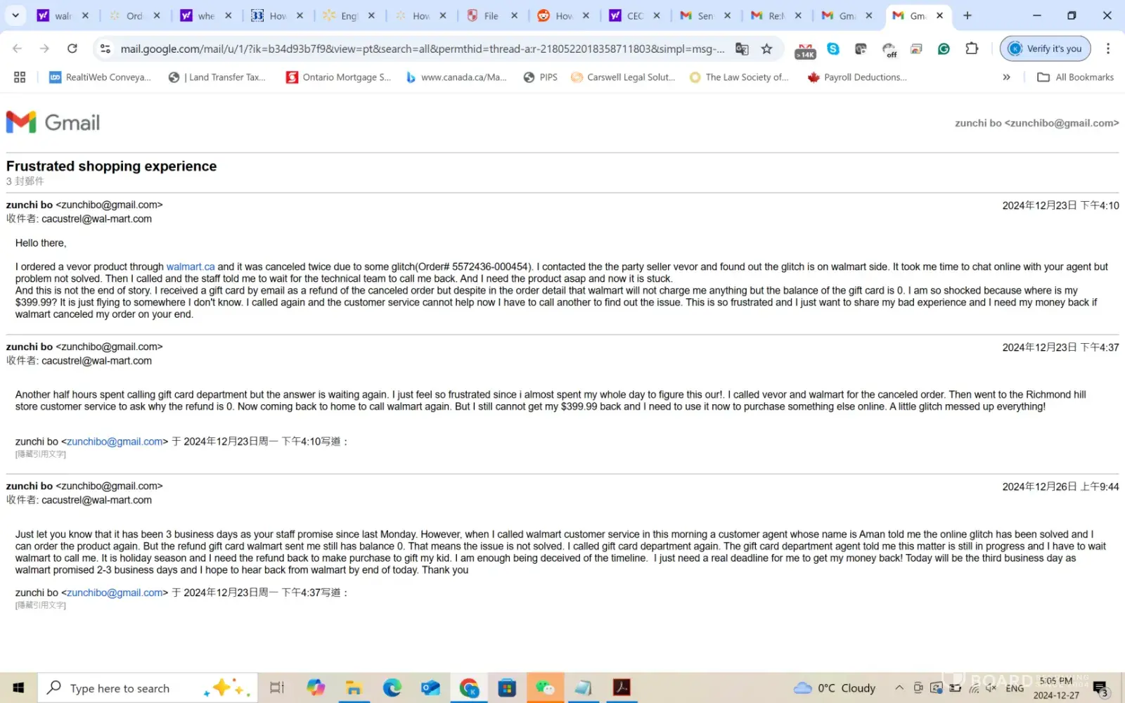I ordered a vevor product through walmart.ca and it was canceled twice due to some glitch. I contacted the third party seller vevor and found out the glitch is on Walmart side. And the gift card I received by email as a refund of the canceled order has 0 balance despite the order detail that Walmart will not charge me anything. It took me time to chat online with walmart agent but the problem not solved. Then I called customer service and gift card department multiple times but every time I was asked to wait until technical team to call me back. Walmart staff promised to call me back within 2-3 business days. I reported the problem on Monday Dec 23,2024 and I called back on Dec 26, 2024 which is on the third business day (23rd, 24th and 26th). I was told I still need to wait and today is Dec 27,2024 and I still did not hear back from Walmart.